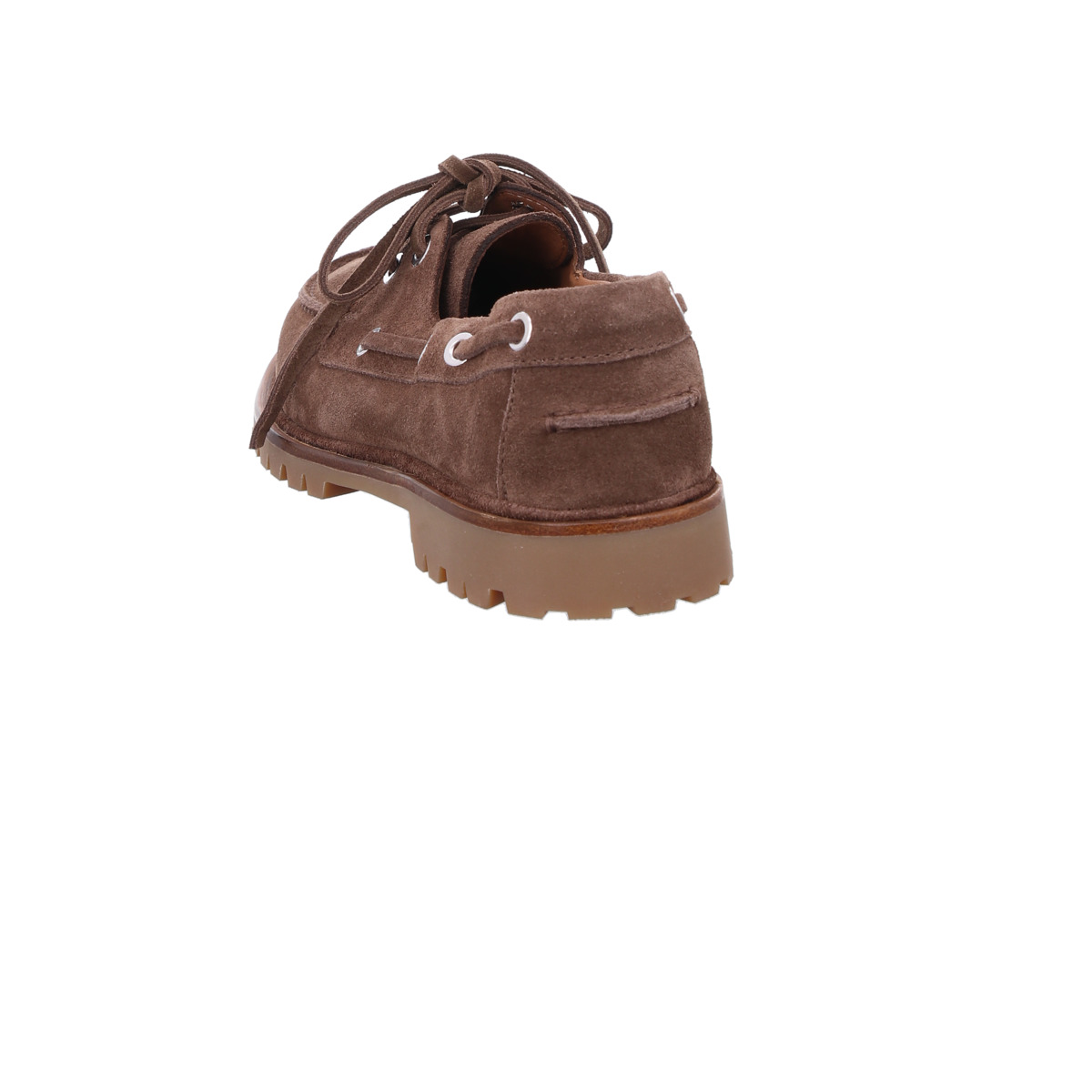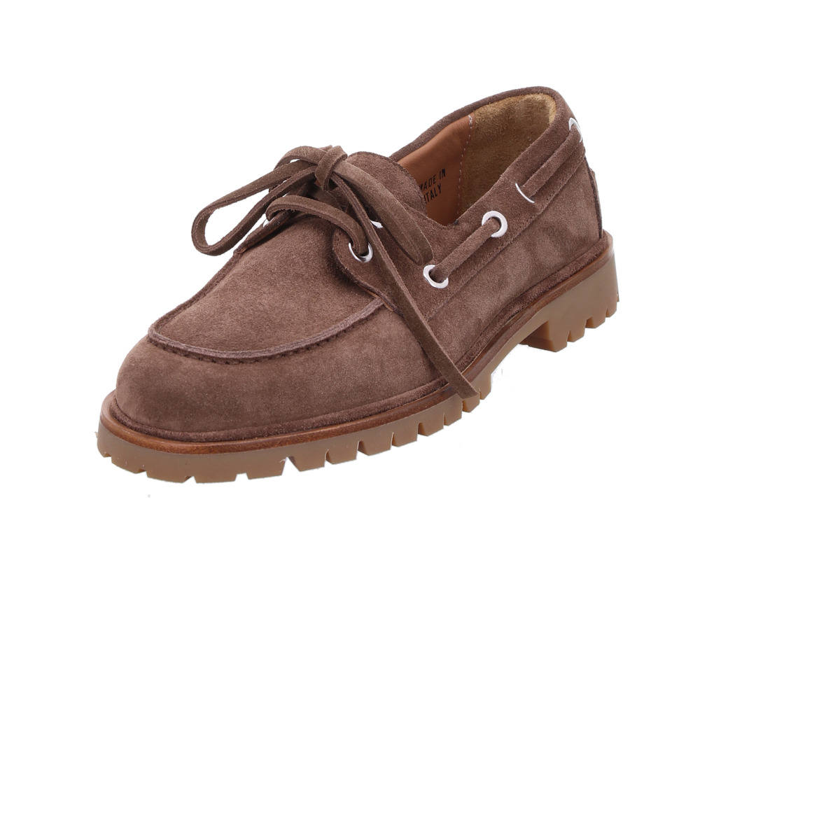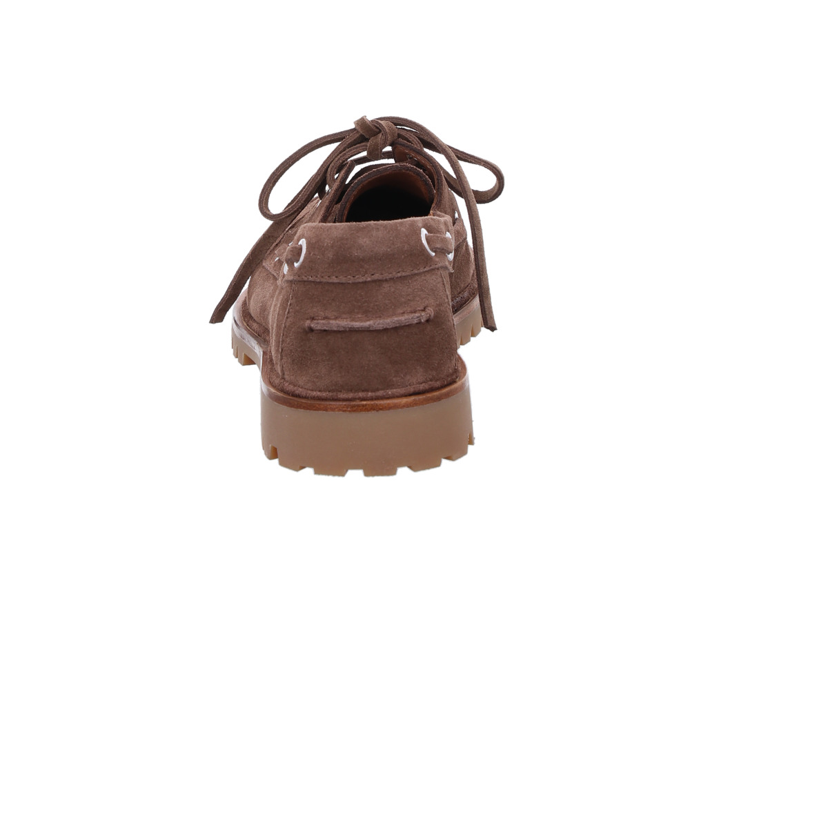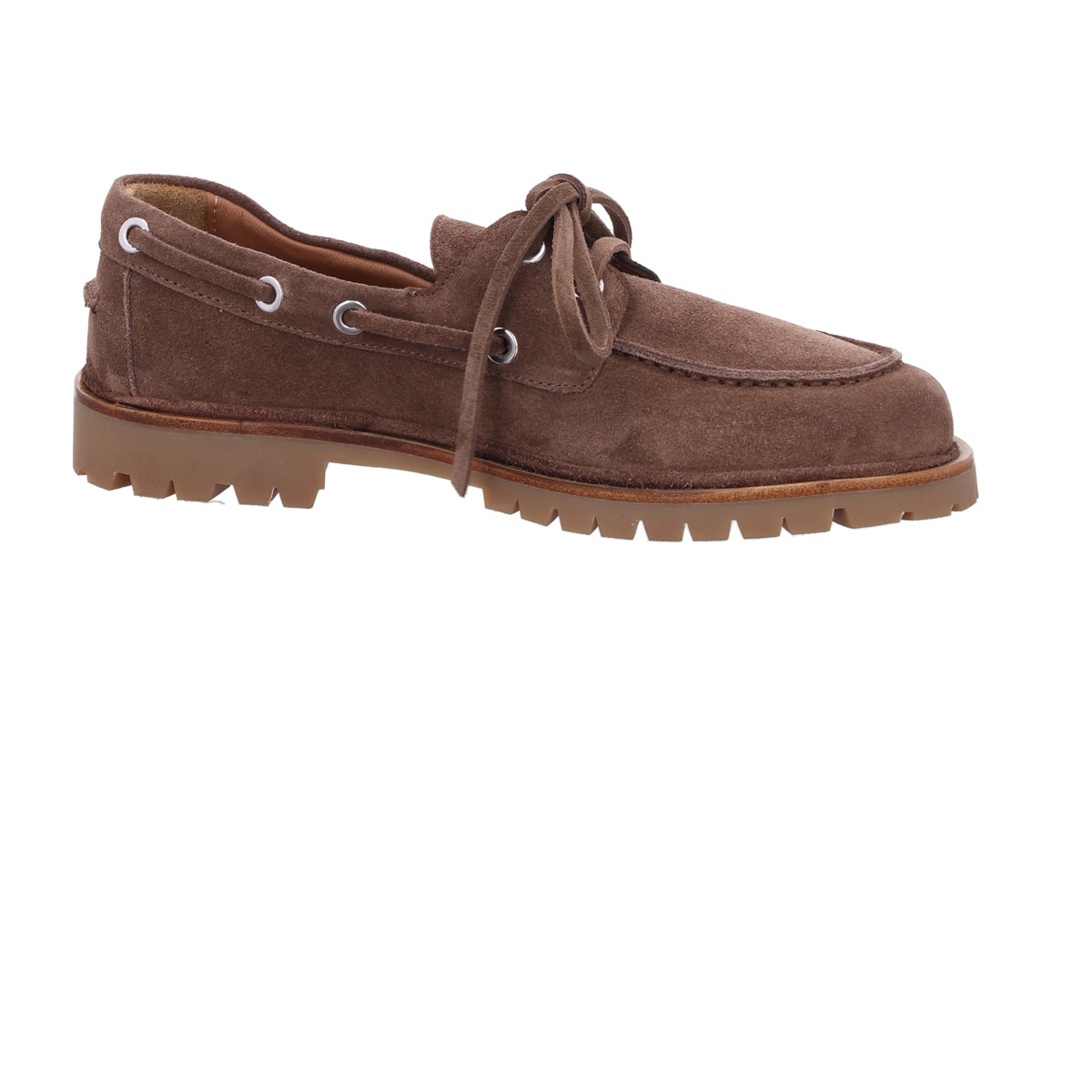 Diesen Schuh würde man stilistisch als Bootsschuh-inspirierten Schnür-Halbschuh oder auch als maritimen Casual-Loafer mit Profilsohle bezeichnen. Die typische 360°-Schnürung mit seitlicher Ösenführung erinnert an einen klassischen Docksider, während die markante Gummiprofilsohle dem Modell eine moderne, urbane Note verleiht.