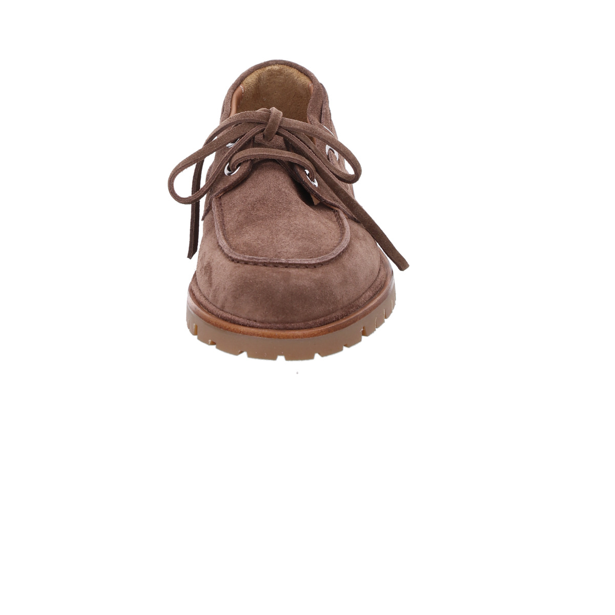 Der Damen-Halbschuh von Elia Maurizi ist aus hochwertigem Veloursleder in warmem Braun gefertigt und überzeugt durch seine weiche Haptik sowie seine hochwertige Verarbeitung. Die rundumlaufende Schnürung sorgt für eine individuelle Passform und unterstreicht den sportiv-eleganten Look.