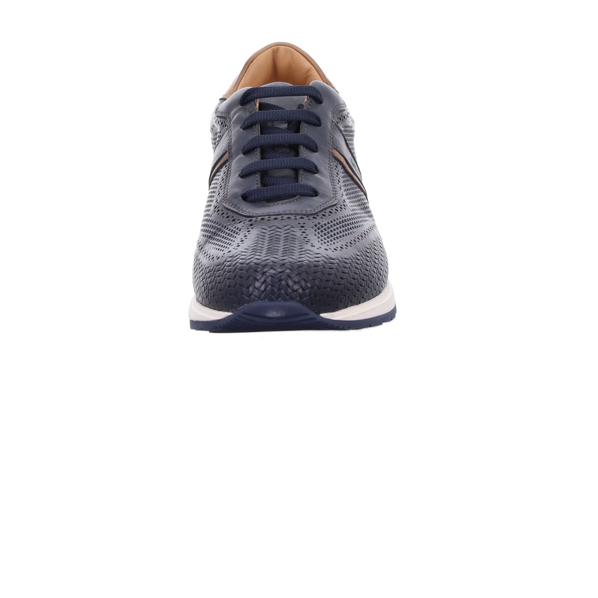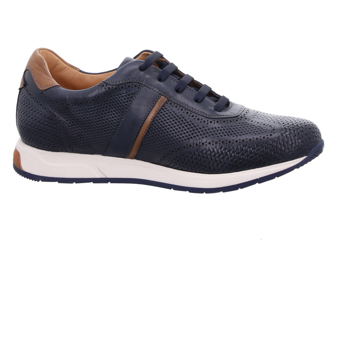 Der Sneaker überzeugt durch seine strukturierte Lederoberfläche und die stilvolle Farbkombination aus tiefem Blau und dezenten braunen Akzenten. Die feinen Perforationen sorgen nicht nur für eine moderne Optik, sondern auch für ein angenehmes Fußklima.