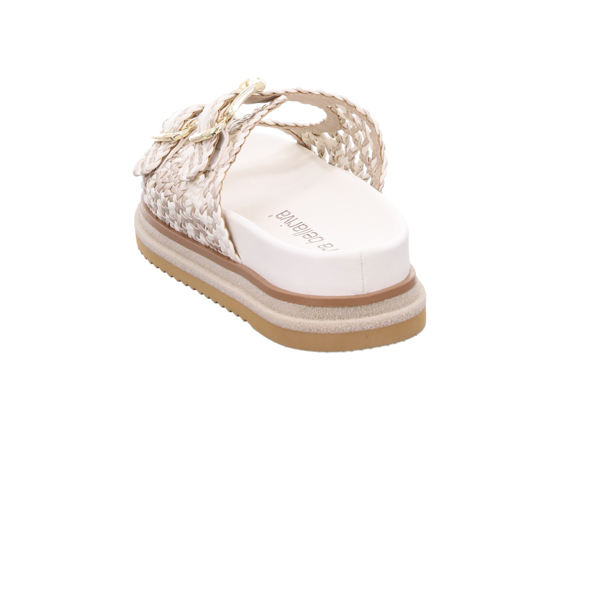 Diese stilvolle Pantolette von Laura Bellariva vereint luxuriöse Handwerkskunst mit modernem Design. Das hochwertige, geflochtene Glattleder in edlem Weiß mit dezenten Metallic-Akzenten verleiht dem Modell eine besondere Tiefe und einen femininen, sommerlichen Look.