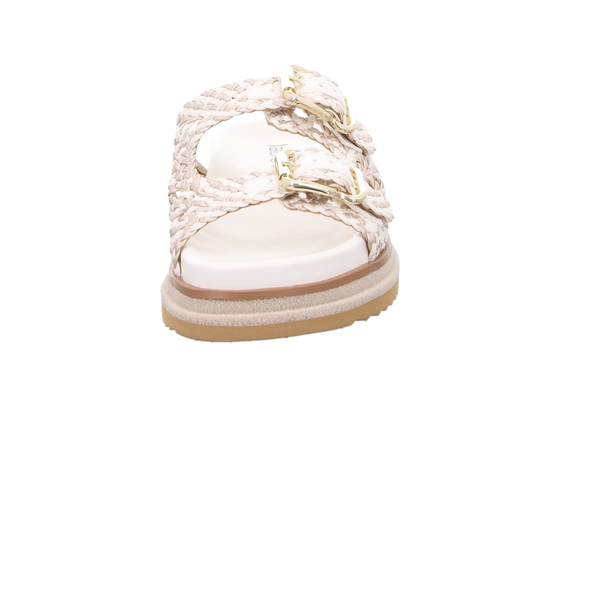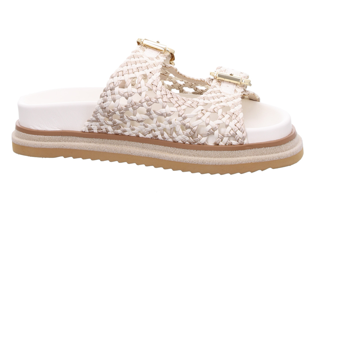 Die zwei breiten Riemen mit markanten, goldfarbenen Schließen setzen modische Highlights und sorgen gleichzeitig für eine individuelle Passform. Das aufwendig geflochtene Leder unterstreicht die hochwertige Verarbeitung und macht jede Pantolette zu einem echten Hingucker. Die komfortable, leicht erhöhte Sohle mit profilierter Laufsohle bietet angenehmen Tragekomfort - perfekt für lange Sommertage.
