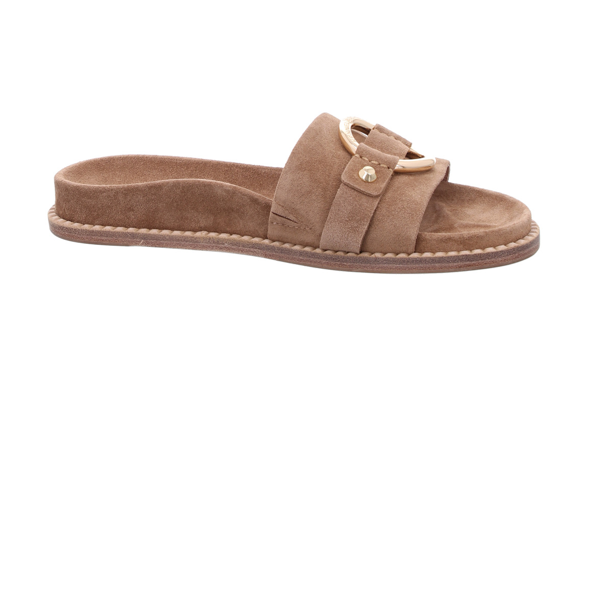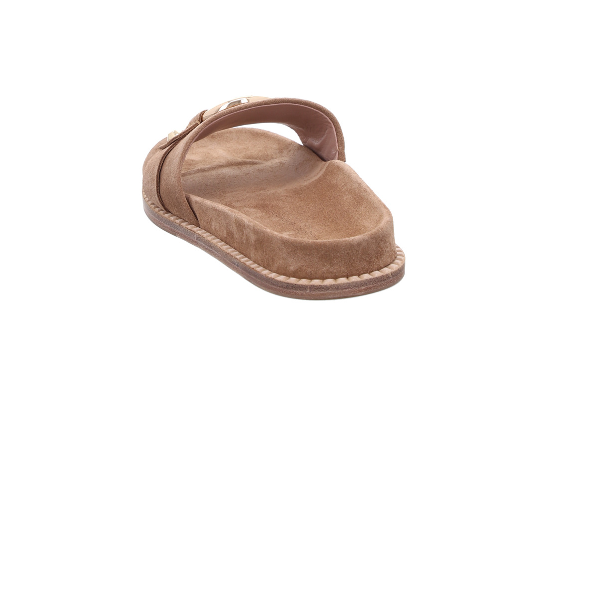 Ein dekoratives Element in Gold setzt einen eleganten Blickfang auf dem breiten Riemen. Die Kombination aus edlem Braunton und goldenen Akzenten verleiht der Pantolette eine feminine, hochwertige Ausstrahlung - perfekt für stilbewusste Looks.