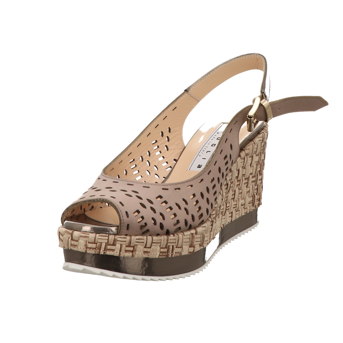 Bruglia! Im Zuge des modischen Comebacks rücken Wedges-Sandalen wieder in den Mittelpunkt der Kollektionen. Das kann man bei dieser Traumhaften Sandale in Taupe auf jeden Fall sagen, da diese perfekt Harmoniert in der Farb- und Materialkombi. Sehr besonders auch der Keilplateau aus geflochtenem Sisal mit einem Streifen aus glänzendem Leder und einer rutschfesten gezackten weißen Gummisohle.