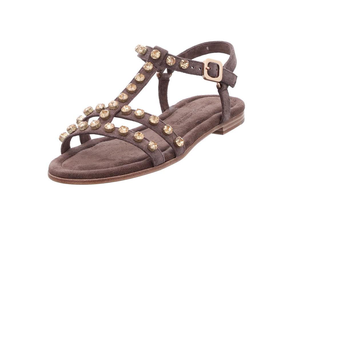 Entlang der filigranen Riemchen setzen goldene Schmucksteine funkelnde Akzente und verleihen der Sandale eine feminine, luxuriöse Ausstrahlung. Das T-Riemchen-Design sorgt für eine elegante Linienführung und unterstreicht die schlanke Silhouette des Fußes.