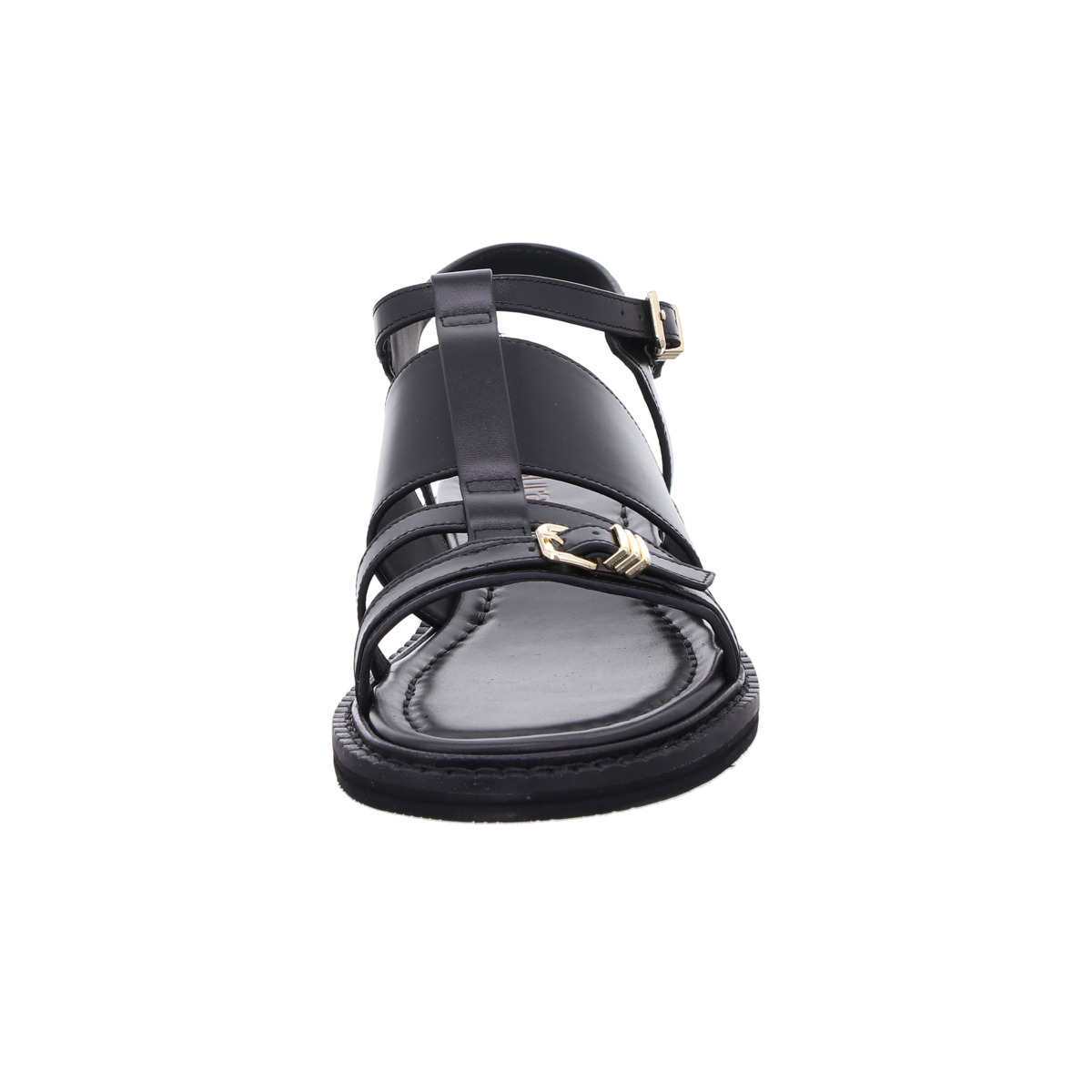 Die raffiniert angeordneten Riemen sorgen für eine moderne Optik und geben dem Fuß gleichzeitig sicheren Halt. Goldfarbene Schnallendetails setzen dezente, edle Akzente und unterstreichen den hochwertigen Charakter der Sandale. Das gepolsterte Fußbett sowie die flache, stabile Laufsohle garantieren angenehmen Tragekomfort - ideal für lange Tage in der Stadt oder entspannte Abendveranstaltungen.