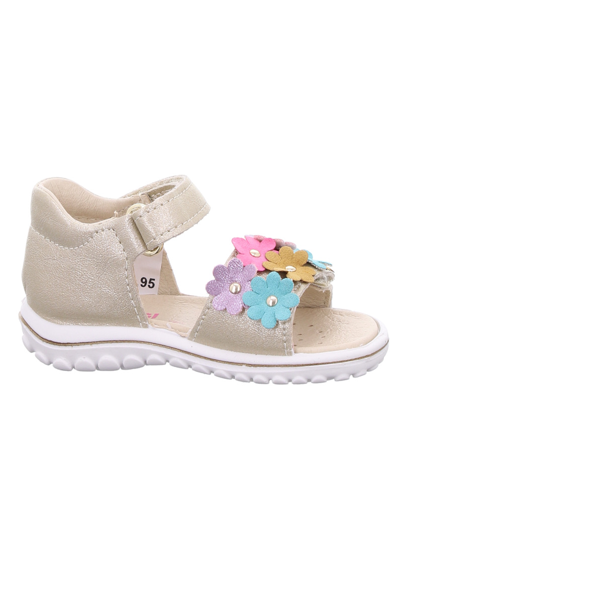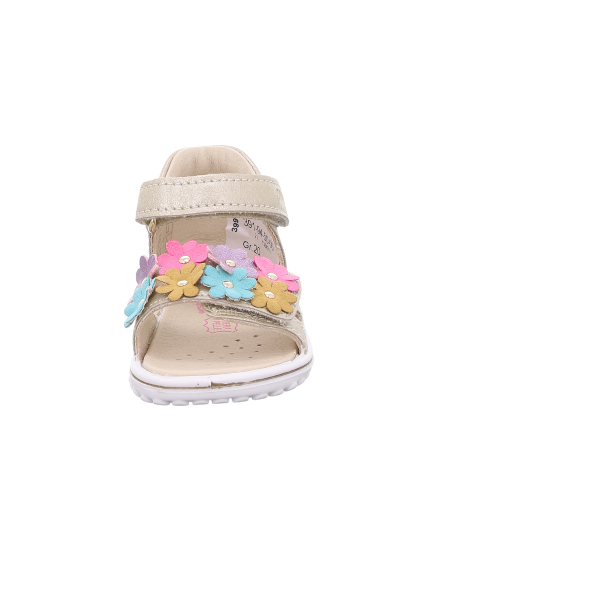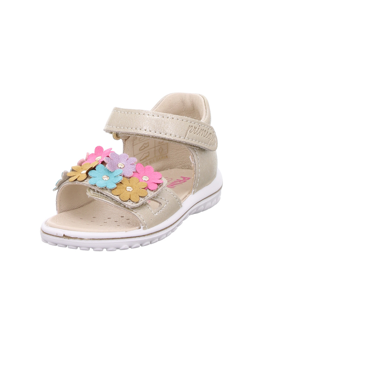 Diese liebevoll gestaltete Primigi Lauflernsandale für Mädchen ist der perfekte Begleiter für die ersten Schritte im Sommer. Das schimmernde Leder in zartem Gold verleiht der Sandale eine edle Optik, während die bunten Blumen-Applikationen auf dem Vorderfußriemen für einen fröhlichen, kindgerechten Look sorgen.