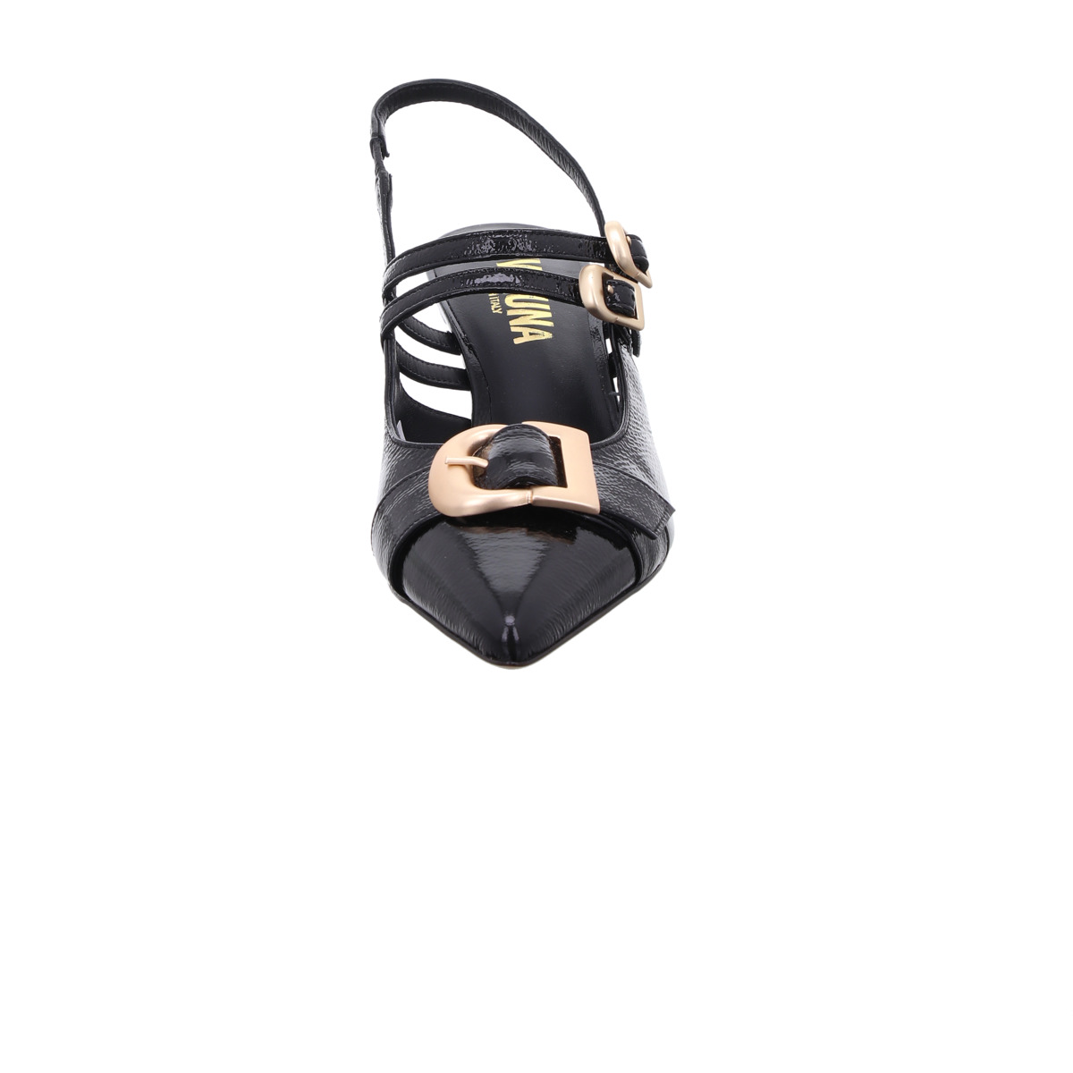 Der elegante Sling Pumps Lea von Evaluna vereint feminine Eleganz mit modernem Design. Gefertigt aus hochwertigem Lackleder in Nero (Schwarz), verleiht der Schuh jedem Outfit eine edle und stilvolle Ausstrahlung.