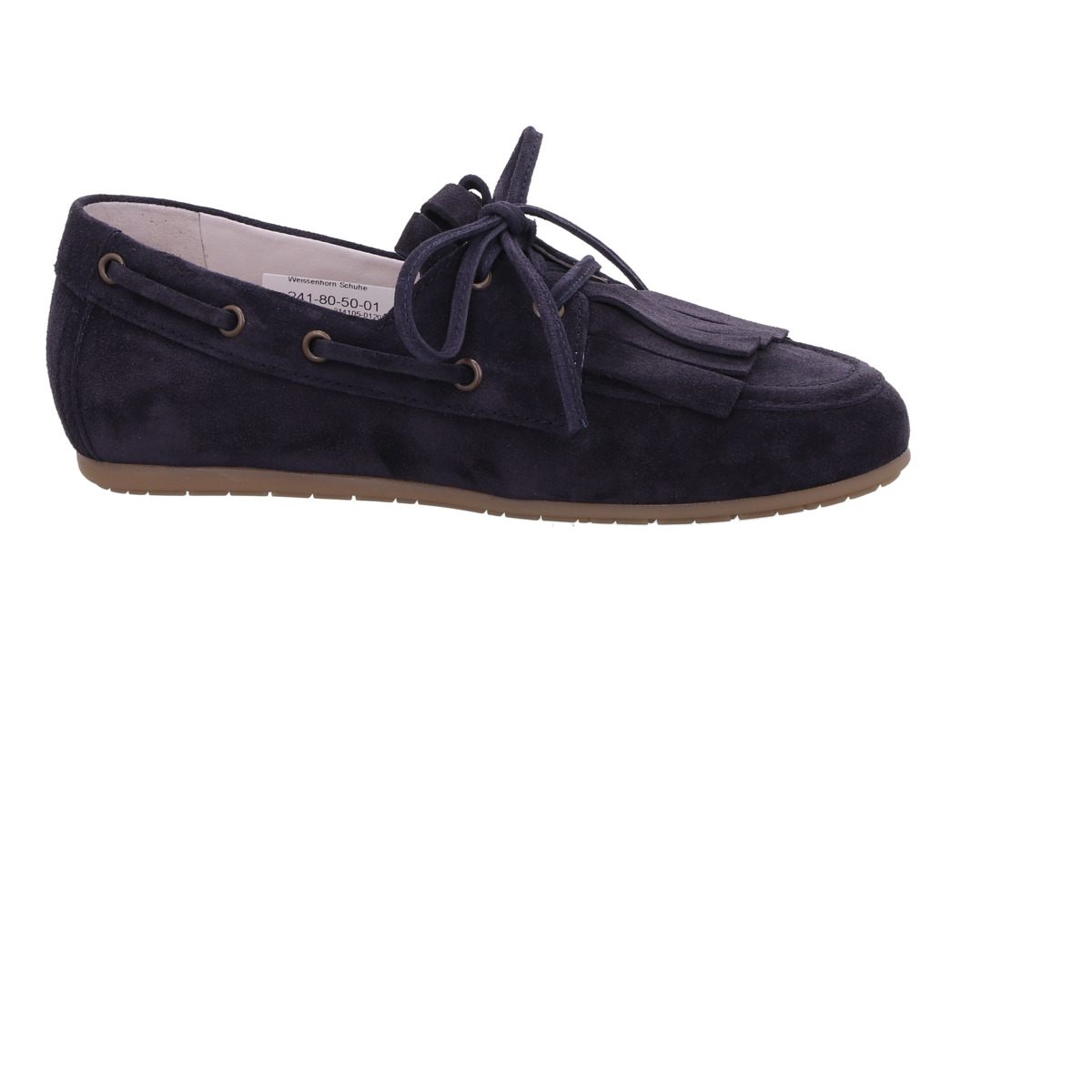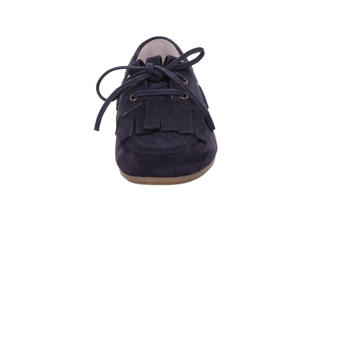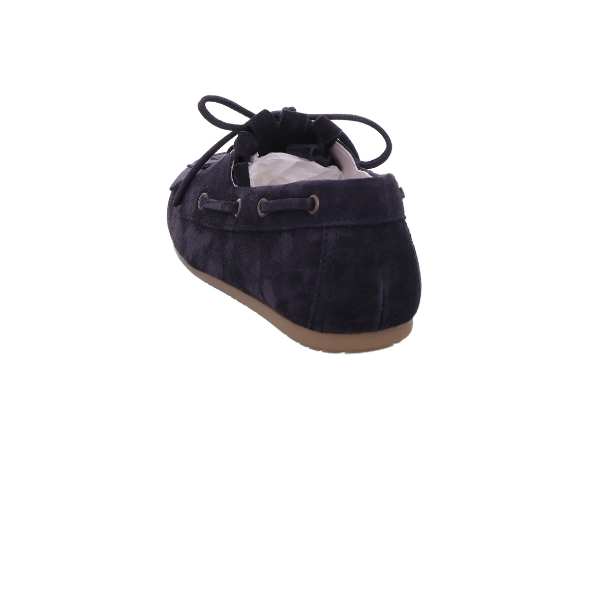 Das dunkelblaue Veloursleder verleiht dem Schuh eine elegante, dennoch entspannte Ausstrahlung. Charakteristisch für das Modell sind die dezenten Fransen auf dem Vorderblatt sowie die lässige Schleife, die dem Slipper einen modisch-sportiven Look verleihen. Die seitlich verlaufende Schnürung unterstreicht den maritimen Stil und sorgt gleichzeitig für eine flexible Anpassung.