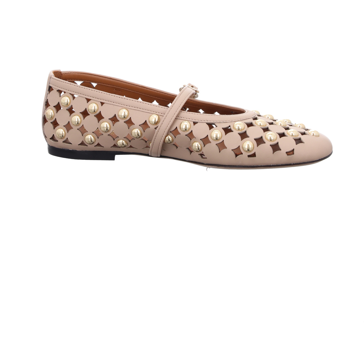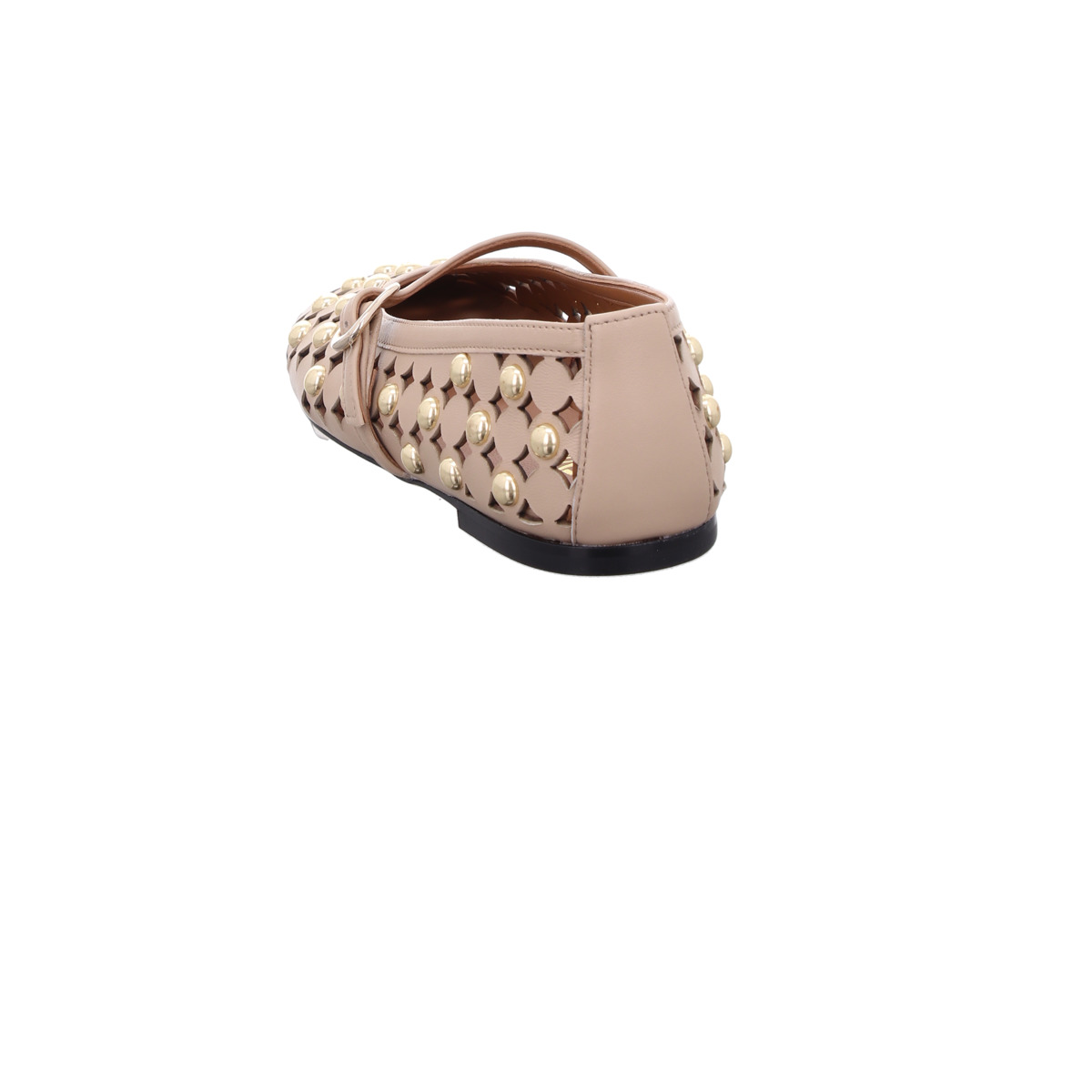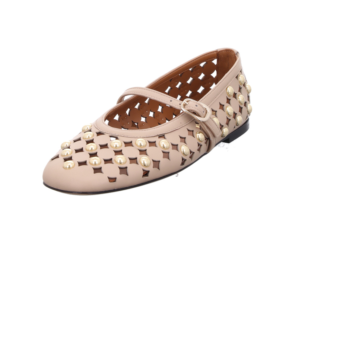Das fein gearbeitete Cut-Out-Muster verleiht dem Schuh eine luftige, sommerliche Leichtigkeit. Goldfarbene Nieten setzen stilvolle Akzente und machen den Ballerina zu einem echten Blickfang. Der schmale Riemen mit verstellbarer Schnalle sorgt für optimalen Halt und unterstreicht den femininen Look.