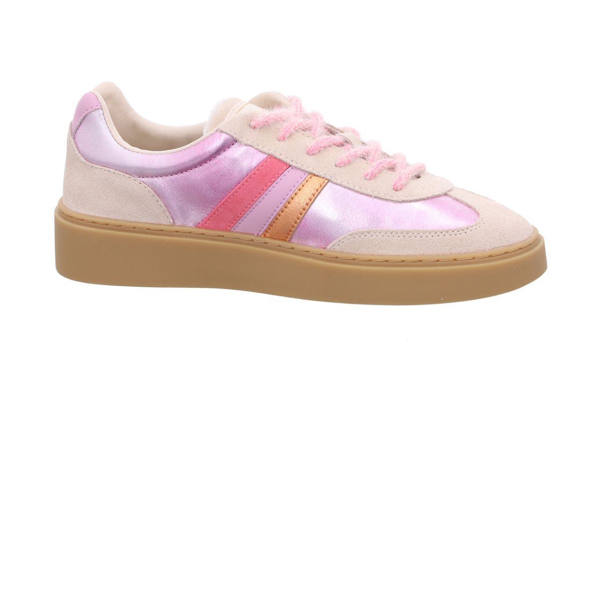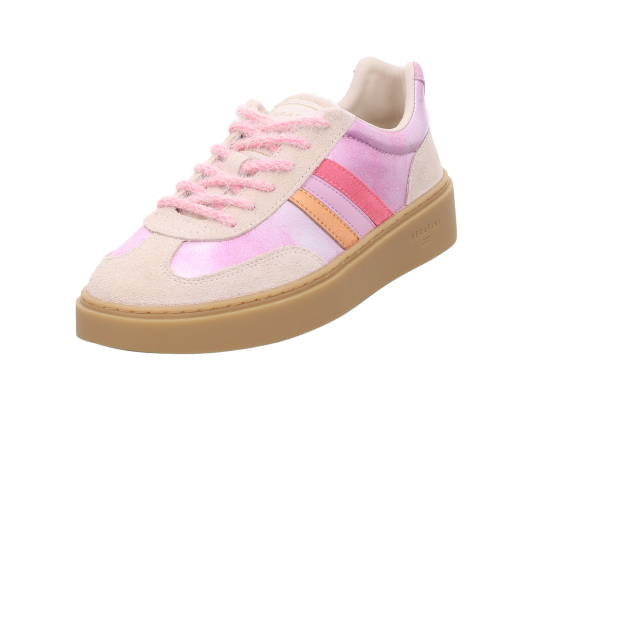 Zarte Rosé- und Pinktöne treffen auf schimmernde Metallic-Elemente und weiches Veloursleder. Die harmonisch abgestimmten Farbnuancen verleihen dem Sneaker eine frische, trendige Ausstrahlung, während der hochwertige Materialmix für ein angenehmes Tragegefühl sorgt. Genau diese kreativen Designs machen die Schuhe von Serafini so besonders und unverwechselbar.