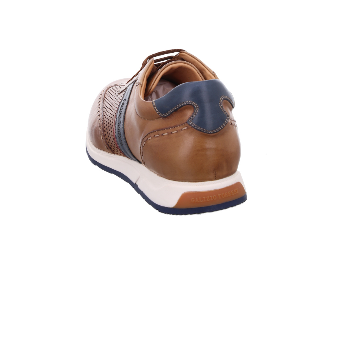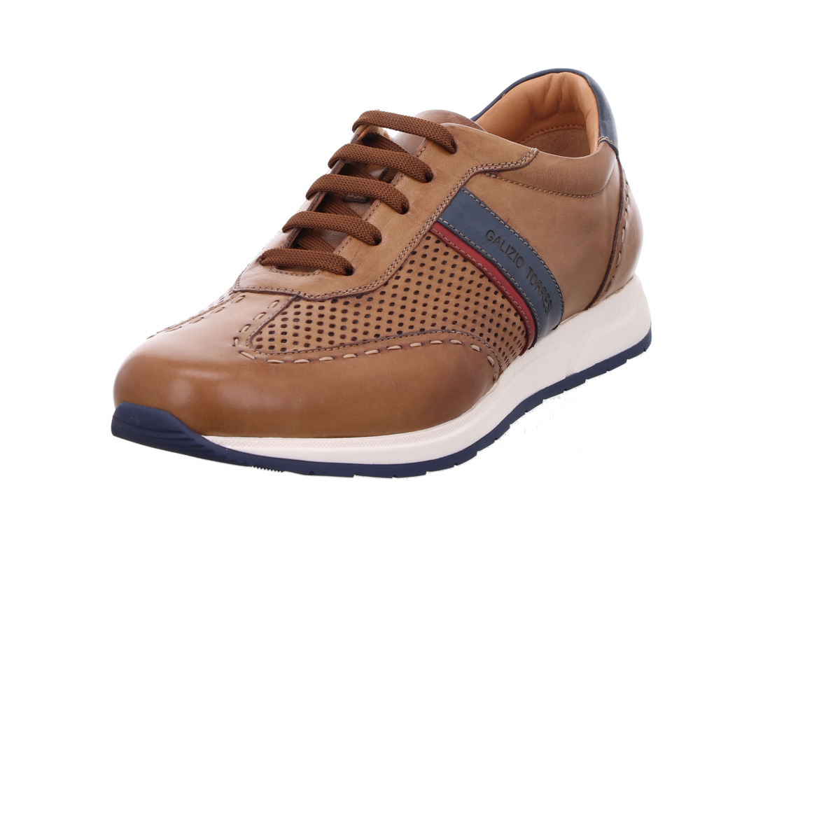 Stilvoll, leicht und perfekt für warme Tage: Dieser Herren Sneaker von Galizio Torresi vereint italienische Handwerkskunst mit sportiver Eleganz. Gefertigt aus hochwertigem Glattleder in Cognac mit blauen Akzenten, überzeugt der Halbschuh durch seine edle Optik und seinen sommerlich-leichten Charakter.